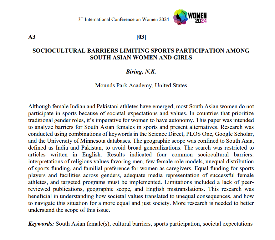 At the time we worked together, Navreen was a high school student in Minnesota whose passions spanned sports, STEM, and advocacy. A volleyball player, violinist, and proud member of the Indian diaspora, Navreen brought a thoughtful, personal lens to her academic work—driven by curiosity about gender equity in athletics across South Asia.